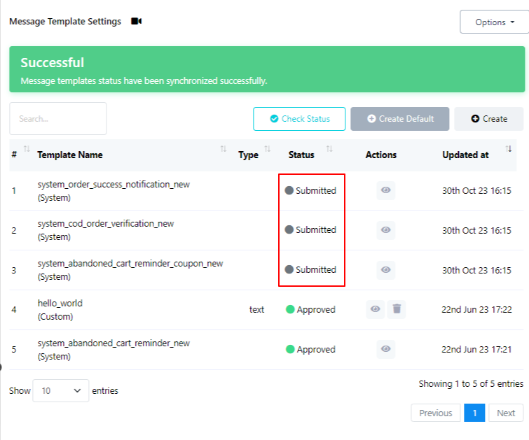 After saving, your newly created template will be listed in the Template section, but its status will initially be marked as `Submitted`. Please be aware that template approval may require some time. Once the template has been reviewed and approved, its status will be updated to `Approved`. Just check the status again to see whether they are approved or not.
